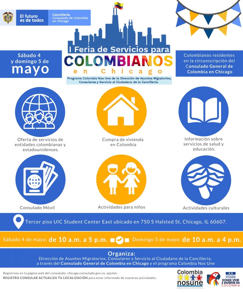 Solo falta 11 días para nuestra 1ra Feria de Servicios en el Midwest, y El consulado de Chicago no solo invita a todos los connacionales sino a que se vinculen y nos colaboren con la difusión y socialización de la participación en la I Feria de Servicios en Chicago de TODA la comunidad colombiana en el Medio Oeste, los días sábado 4 y domingo 5 de mayo.