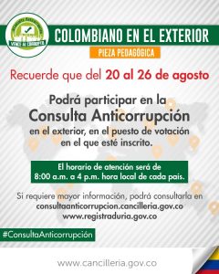 Buenos días. Nos permitimos informar que la consulta popular anticorrupción, será del lunes 20 de agosto al domingo 26 de agosto de 2018.